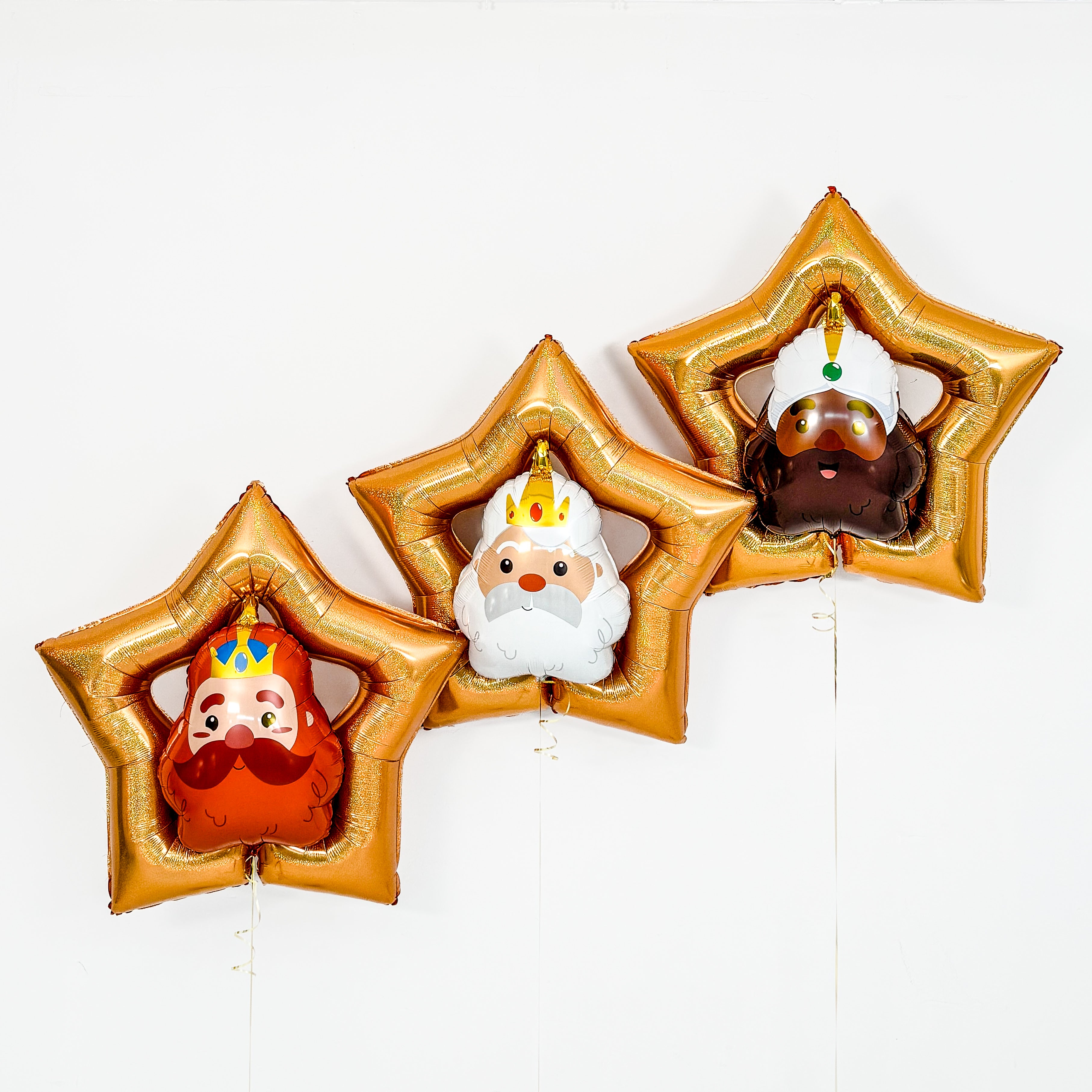 Celebra la noche más mágica del año con este set de globos de Reyes Magos, ideal para decorar el hogar y acompañar los regalos. El conjunto incluye globos de foil con las caritas de Melchor, Gaspar y Baltasar, integrados en elegantes estrellas doradas metalizadas.