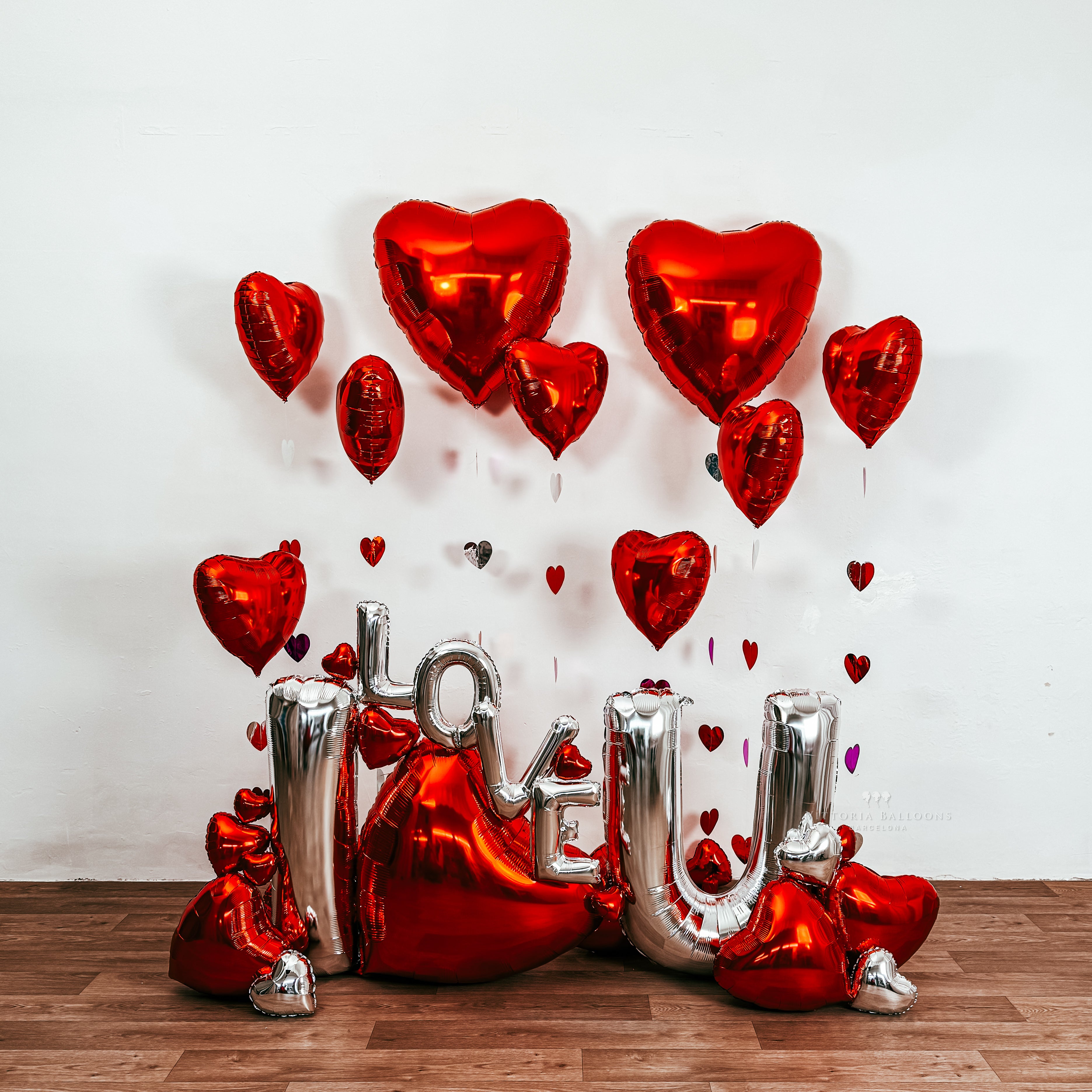 El diseño combina globos metalizados en tonos rojos y plateados, con letras gigantes que forman el mensaje “I LOVE YOU”, rodeadas de corazones que aportan volumen, brillo y un efecto visual impactante.