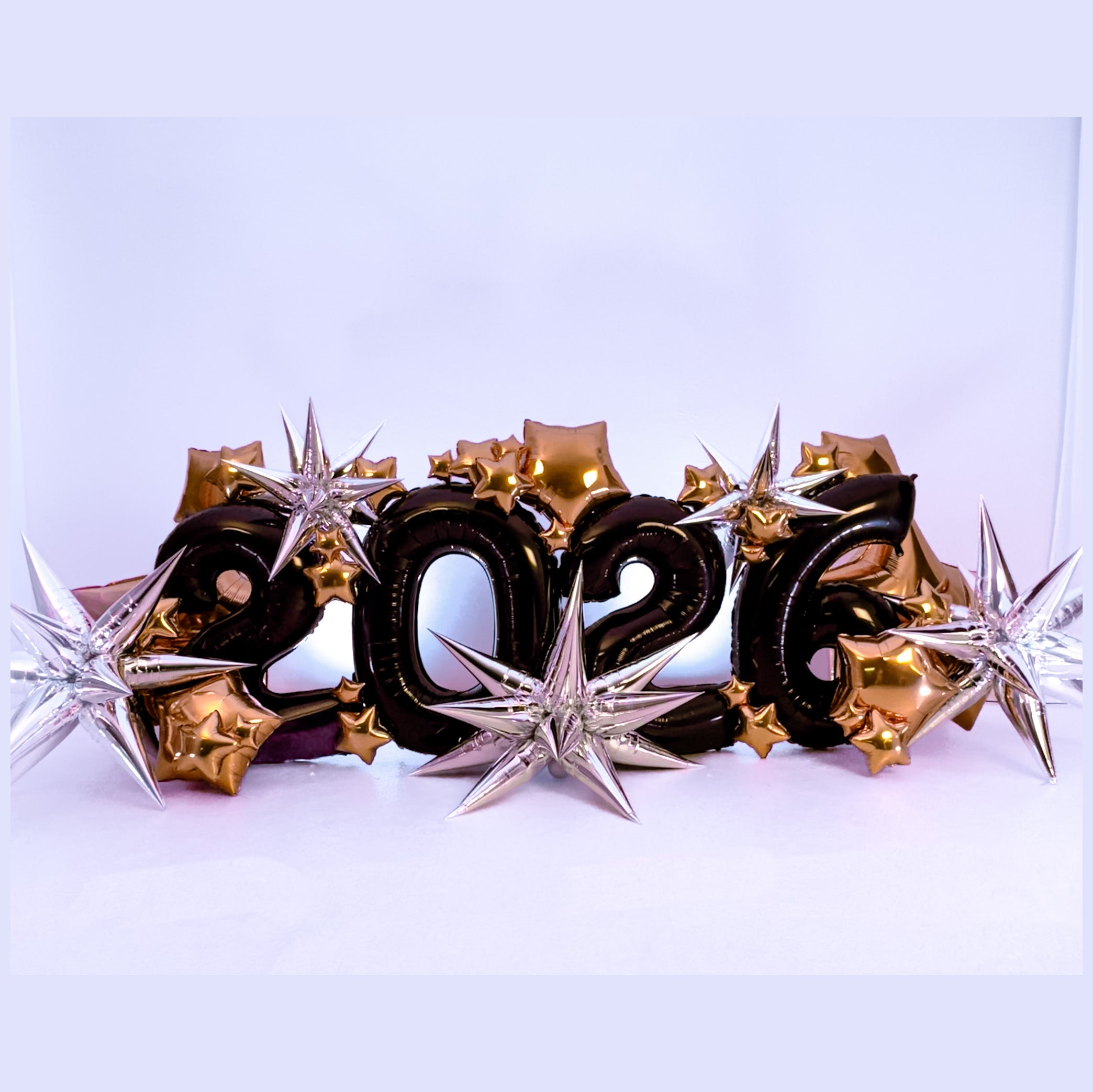Photocall de globos foil con números 2026 en color negro, combinados con estrellas metalizadas en oro y plata, ideal para celebraciones de fin de año con un estilo elegante y sofisticado.