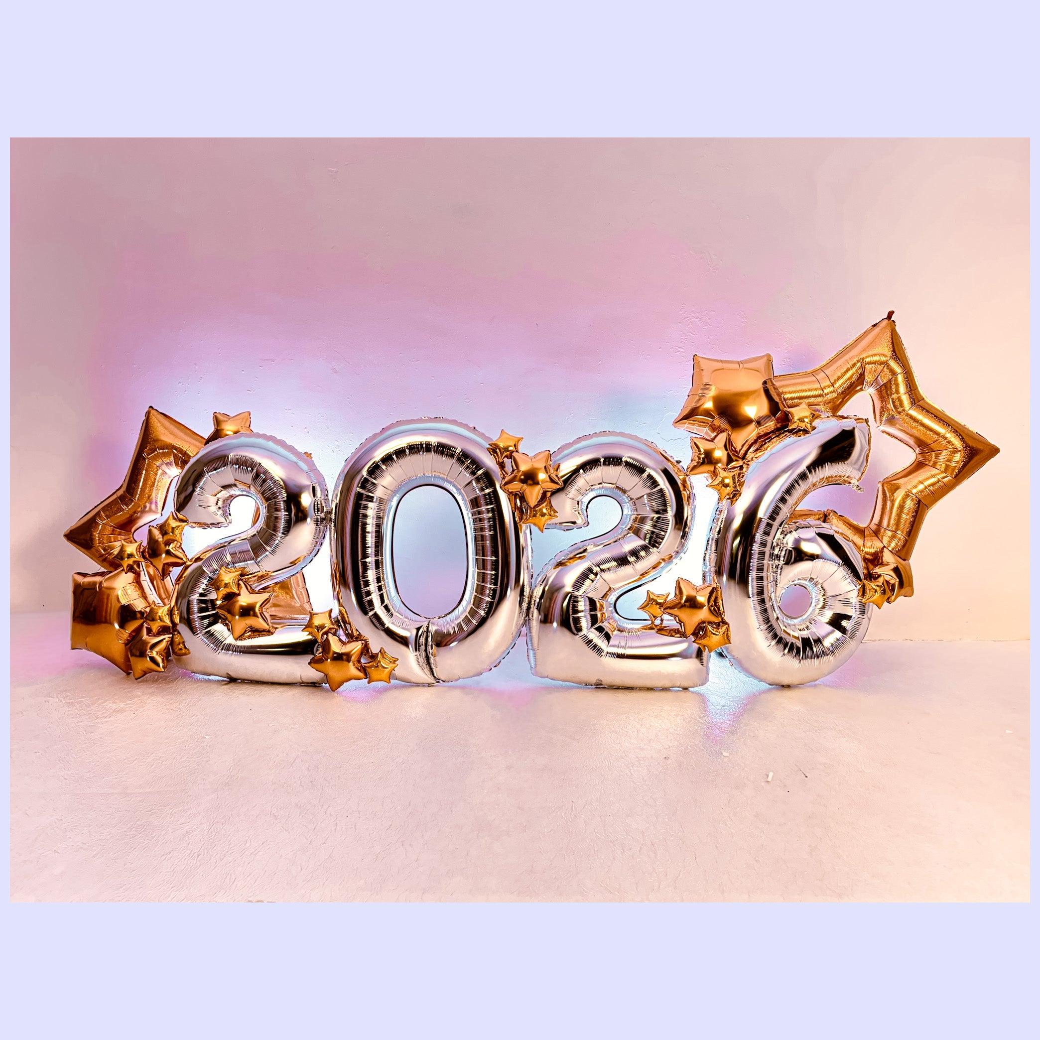 Photocall de globos foil con números 2026 en gran tamaño y estrellas metalizadas en plata y oro, ideal para dar la bienvenida al nuevo año con un montaje elegante y llamativo.